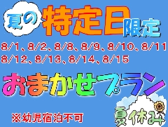 当館の都合で申し訳ございません。スタッフ不足対応として「大人」「小学生」のみ、ご宿泊できる設定をしたプランになります。幼児さまのご宿泊は出来ません。ゴメンナサイ ご宿泊可能期間 2026/08/01 - 2026/08/15 |